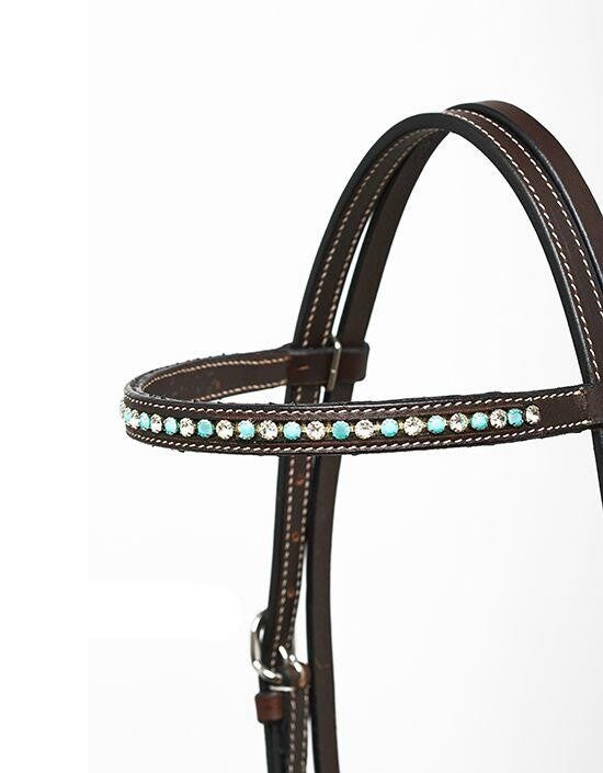 Dunkles Kopfstück mit türkisfarbenen Applikationen.